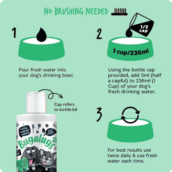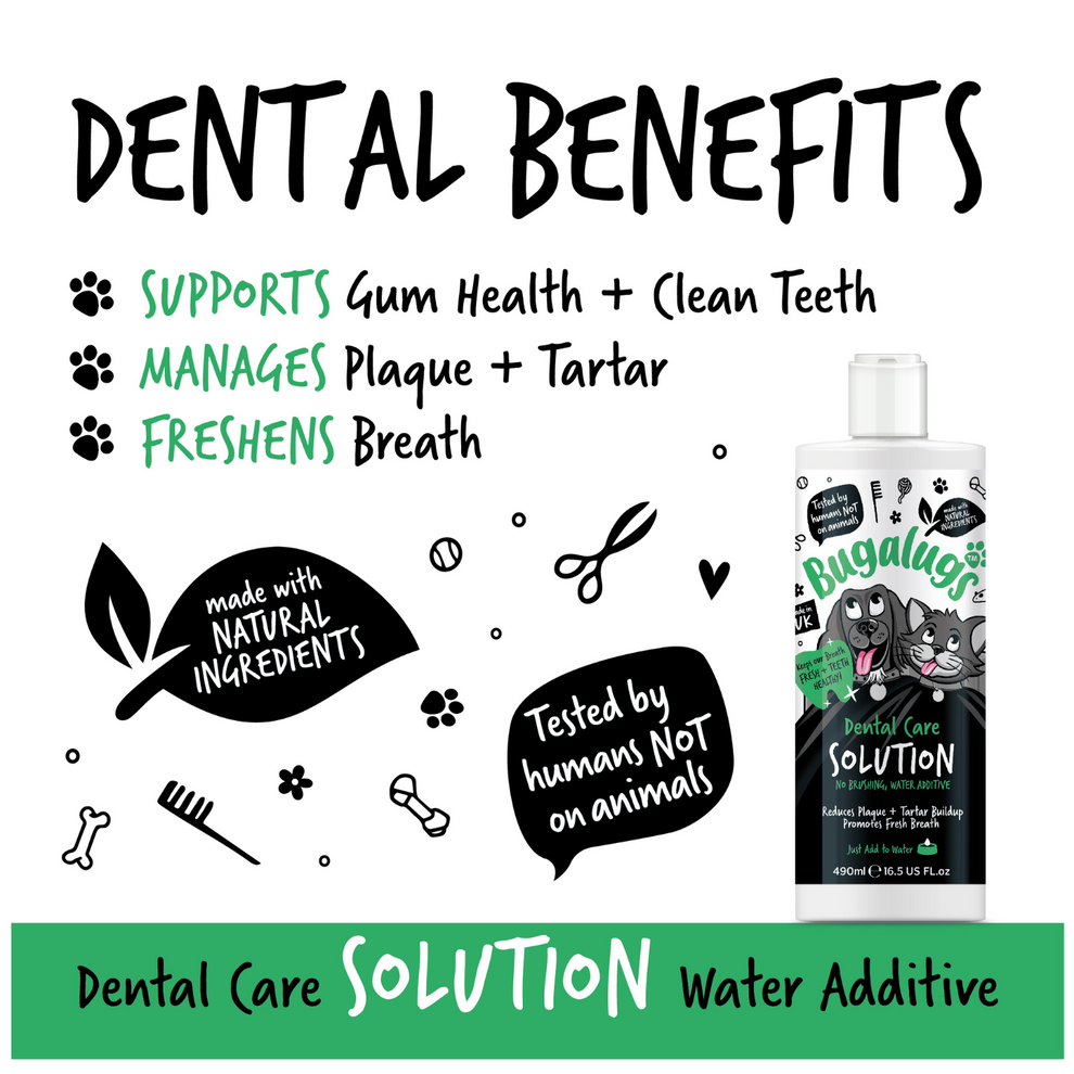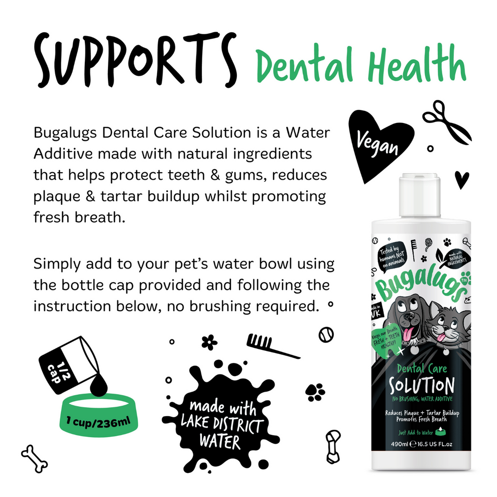 Bugalugs Dental Care Water Additive یک محلول مراقبتی کاملاً ایمن و بدون الکل است که با اضافه‌شدن به آب نوشیدنی روزانه، به تمیزی دهان و دندان حیوان کمک می‌کند.